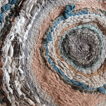 Tapeçarias de pequena escala com estruturas de madeira encontradas na praia e flores secas recolhidas no campo.
